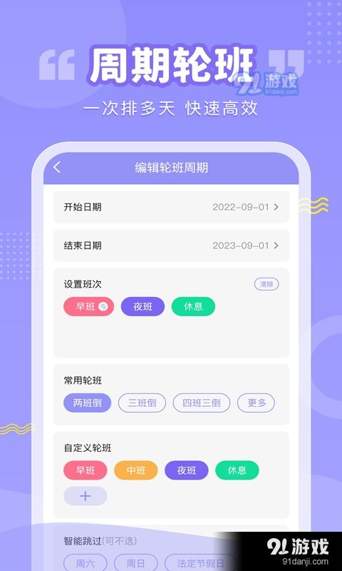 1. 创建排班表:进入app,点击“创建排班表”,设置排班规则,如工作日、休息日、加班等。